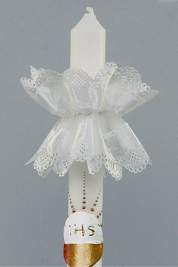 Am Tag der Erstkommunion lohnt es sich, auf jedes noch so kleine Detail zu achten, damit sich unser Kind wohlfühlt und glänzen kann. Kommunionkerzenhalter sind eine unglaublich praktische Ergänzung zur Kerze. Sie bieten dem Kind während der Zeremonie Schutz und verhindern, dass das Wachs tropft. Darüber hinaus sind Kommunionkappen ein hervorragendes Styling-Element für einen schönen Look. Wir bieten zwei Arten von Kommunionstropfen an - klassisch dekoriert und mit einem einzigartigen Blumenstrauß verziert. Unsere Produkte werden mit Bedacht und Engagement hergestellt. Die Baldachine sind aus Satin oder Tüll, mit schönen Verzierungen, in Form eines Kegels oder einer Rüsche, so dass sie auf der Erstkommunionfeier wunderschön aussehen werden.