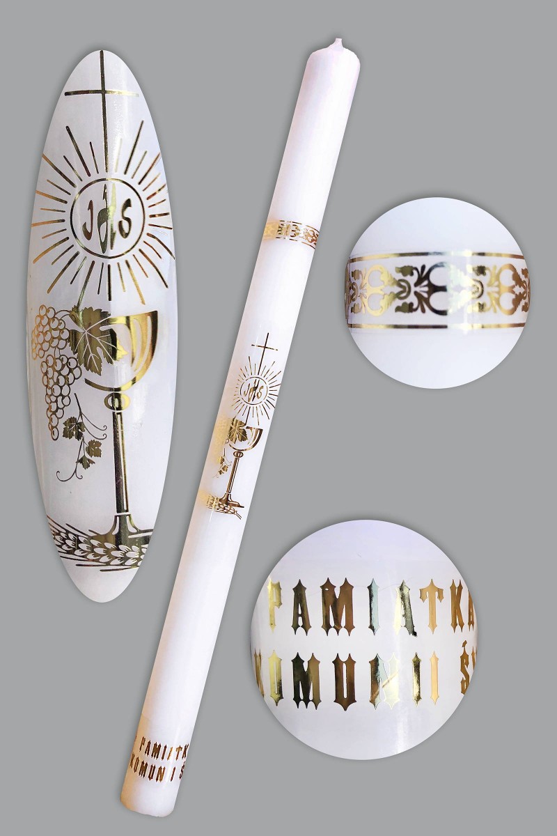 Kommunionskerze, hergestellt in Polen unter Verwendung von Wachs von sehr hoher Qualität. Ein elegantes Erinnerungsstück an den Empfang des Sakraments der Erstkommunion. Artikel aus der Kategorie: Abendmahlskerzen.