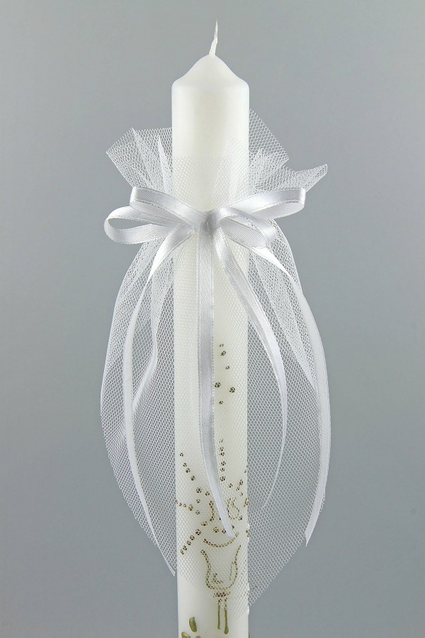 Kommunionskerze, hergestellt in Polen unter Verwendung von Wachs von sehr hoher Qualität. Ein elegantes Erinnerungsstück an den Empfang des Sakraments der Erstkommunion. Artikel aus der Kategorie: Abendmahlskerzen.