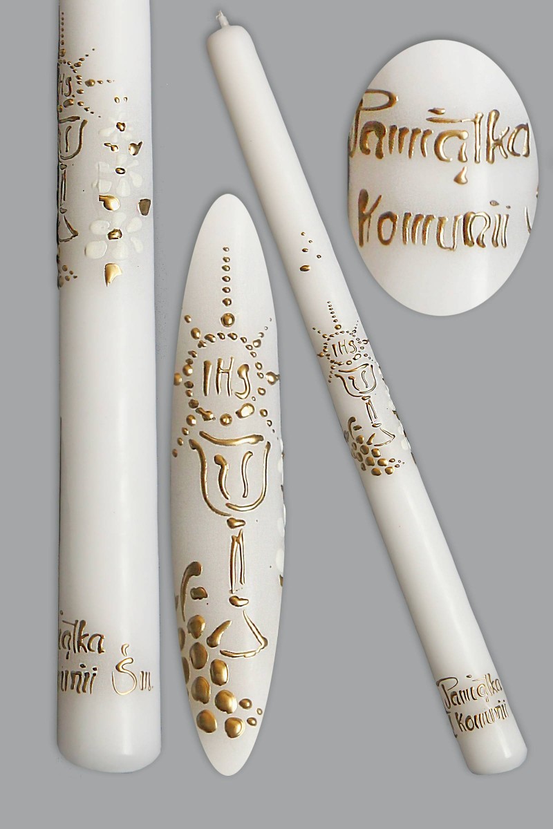 Kommunionskerze, hergestellt in Polen unter Verwendung von Wachs von sehr hoher Qualität. Ein elegantes Erinnerungsstück an den Empfang des Sakraments der Erstkommunion. Artikel aus der Kategorie: Abendmahlskerzen.