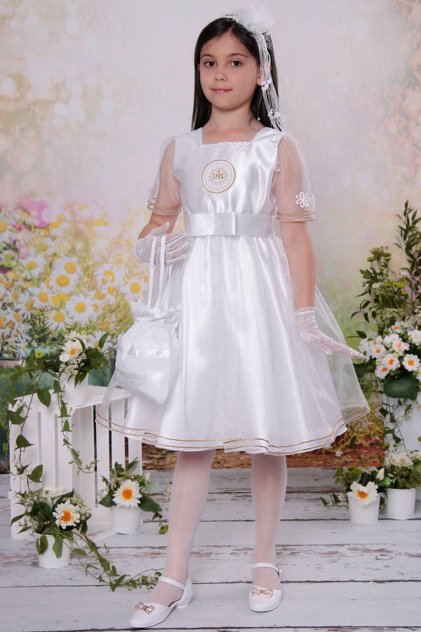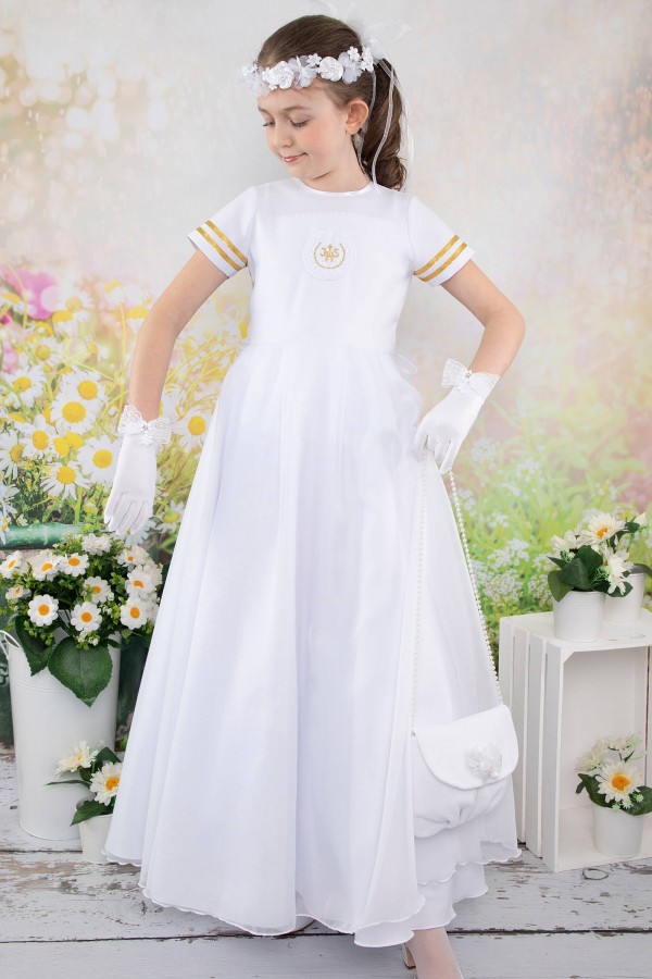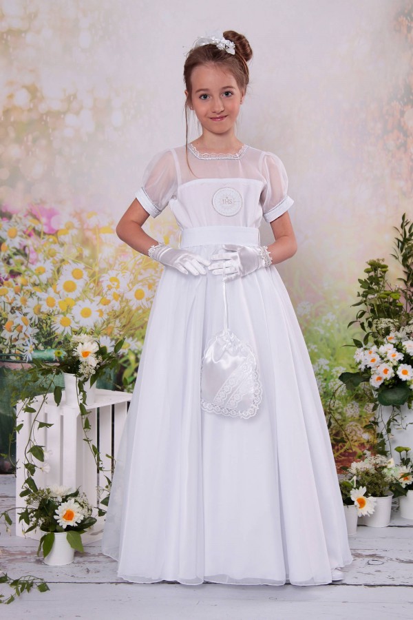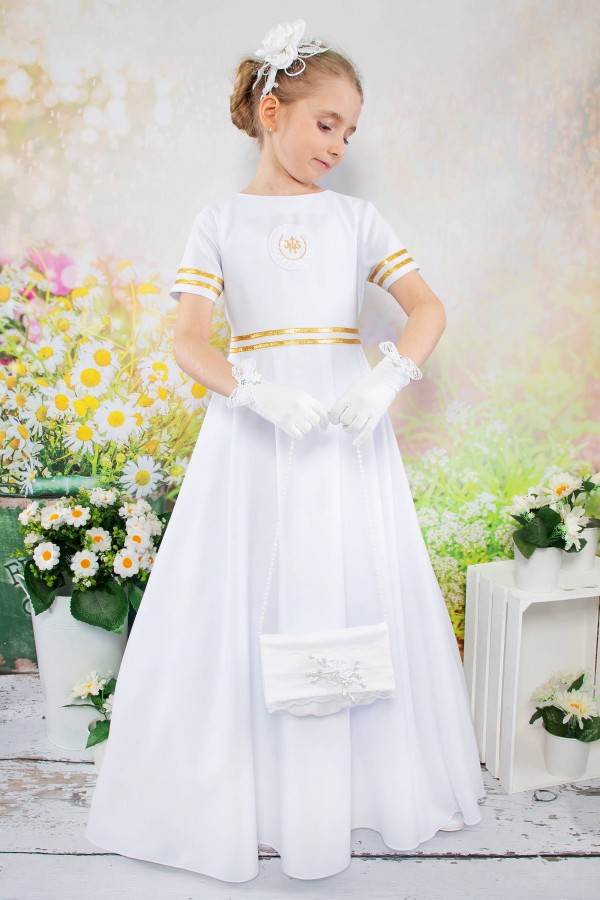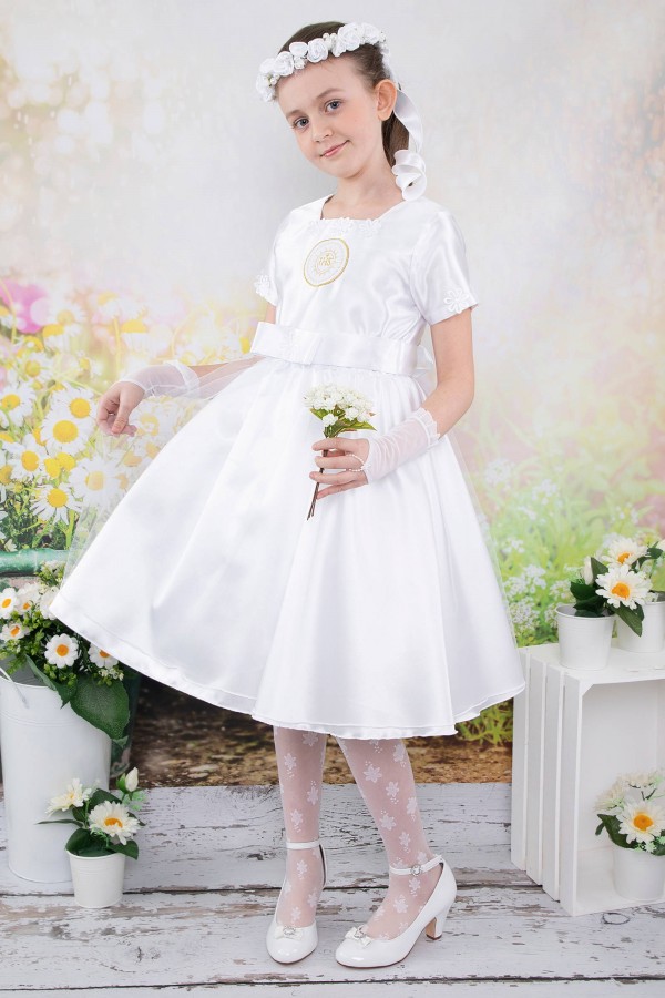 Klassische Kommunionskleider für Mädchen sind eine interessante Alternative zu Kommunionsalben. Die Kleider zeichnen sich durch ihren einzigartigen Schnitt aus, der der aktuellen Mode angepasst ist. Für ihre Herstellung verwenden wir in der Regel hochwertigen Satin und Gabardine. Wir bieten verschiedene Arten von Ausschnitt - hoch, klassisch Diamant oder Diamant mit Spitze Baumwolle. In unserem Shop finden Sie klassische Kommunionskleider mit langen oder kurzen Ärmeln, die perfekt zu den Kommunionshandschuhen passen. Wir bieten sowohl knielange als auch knöchellange Kleider an. Bei der Erstkommunion ist es äußerst wichtig, dass sich das Mädchen in seiner Kleidung tadellos und wohl fühlt. Beide Eigenschaften werden von den klassischen Kommunionkleidern erfüllt. Das Kleid kann mit ästhetischen Accessoires kombiniert werden - darunter eine Handtasche, eine Girlande oder eine Strumpfhose.