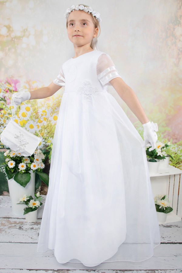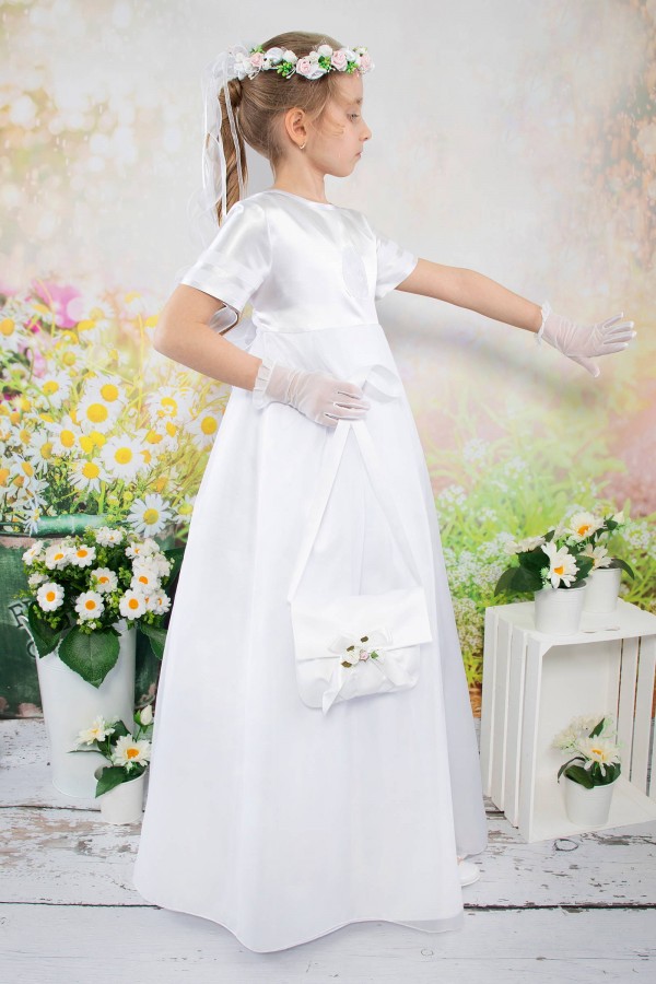 Josephine Kommunionskleider zeichnen sich durch ihre perfekte Leichtigkeit und ihren französischen Stil aus. Der ausgestellte Rock sowie die breiten Falten und die leicht gekräuselte Rückenpasse verleihen dem Kleid außergewöhnliche Eleganz und Komfort. Josephine-Kleider sorgen dafür, dass ein Mädchen am Tag ihrer Erstkommunion adrett aussieht. Wir bieten Józefin-Kleider sowohl mit langen als auch mit kurzen Ärmeln an. Die Kleider passen perfekt zu den Accessoires des Kommunionskleides - wie Handtaschen, Handschuhe oder goldene und silberne Hostien. Wir verwenden für die Herstellung hochwertige Gabardine, Satin oder Chiffon. In unserem Shop haben wir eine große Auswahl an Josephine Kommunionkleidern, die sowohl Eltern als auch ihren Kleinen gefallen werden.